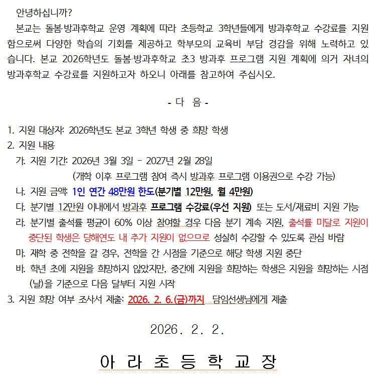 2026학년도 초3 방과후 프로그램 이용권 지원 희망 조사 안내