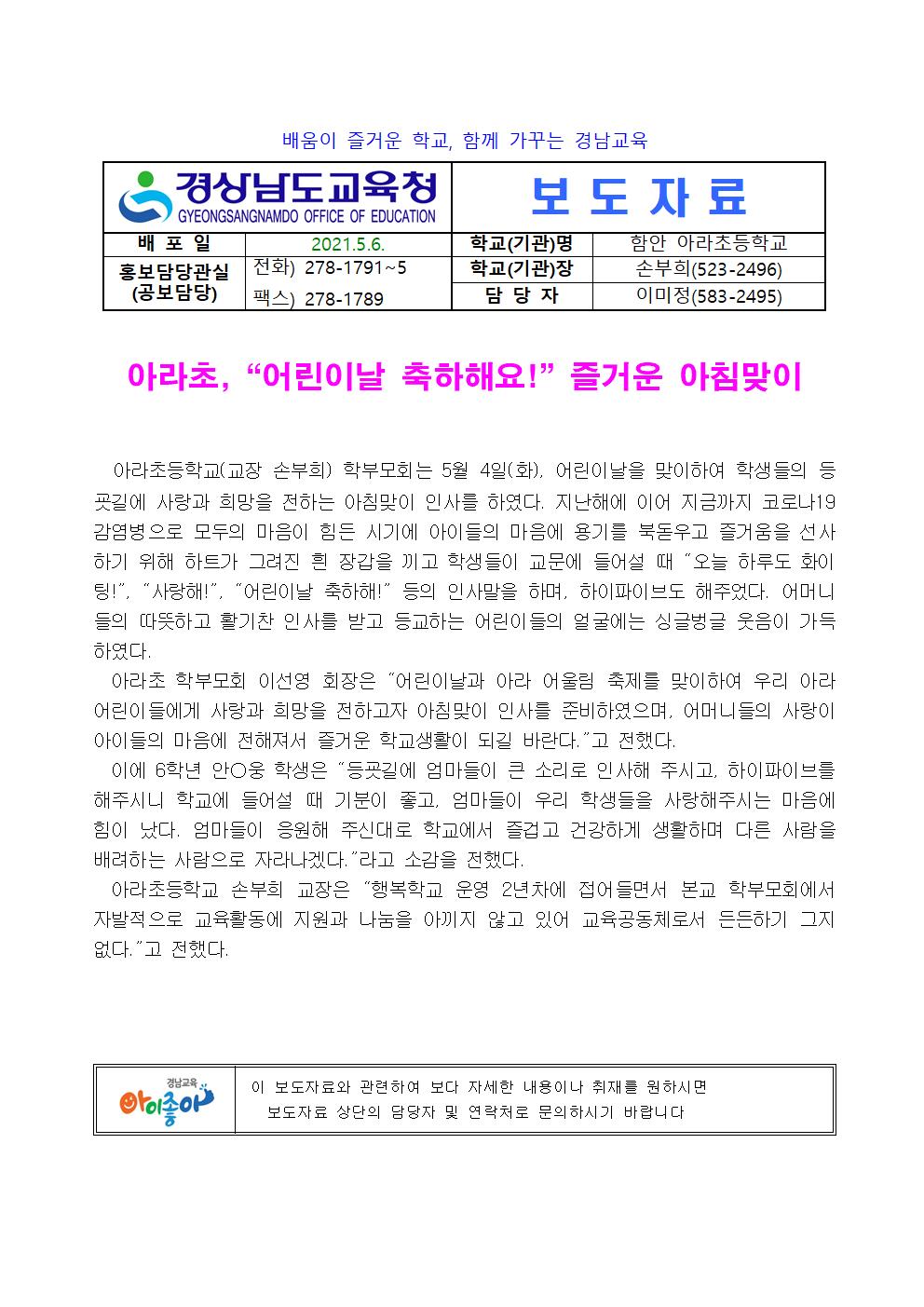아라초, 어린이날 기념 아침맞이 보도자료.hwp