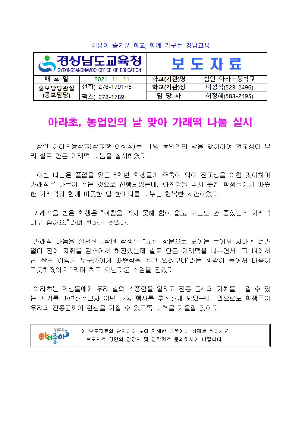 아라초 농업인의 날을 맞이하여 가래떡 나눔 실시.hwp
