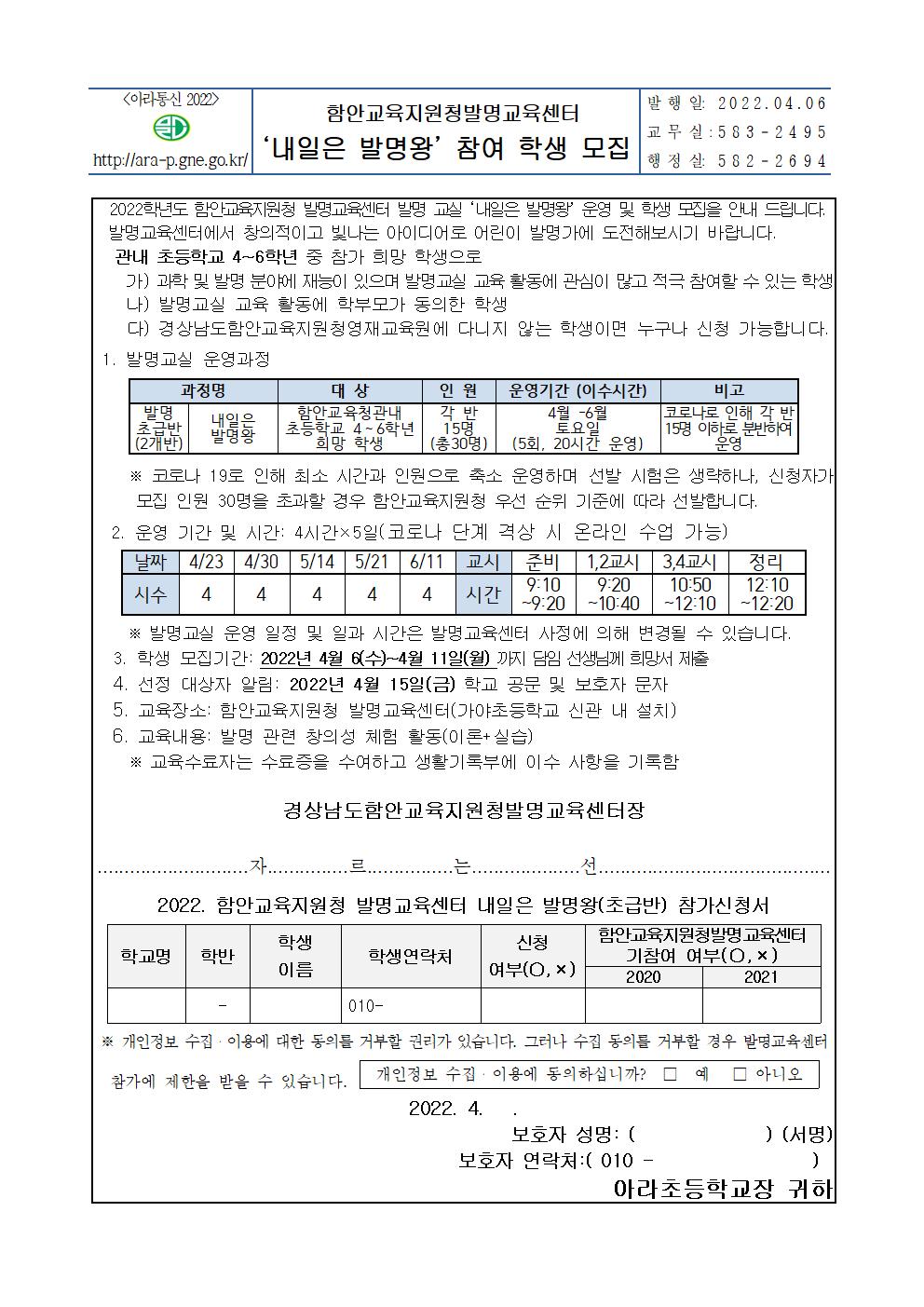 2022. 내일은 발명왕!(초급반) 학생 모집 가정통신문.hwp
