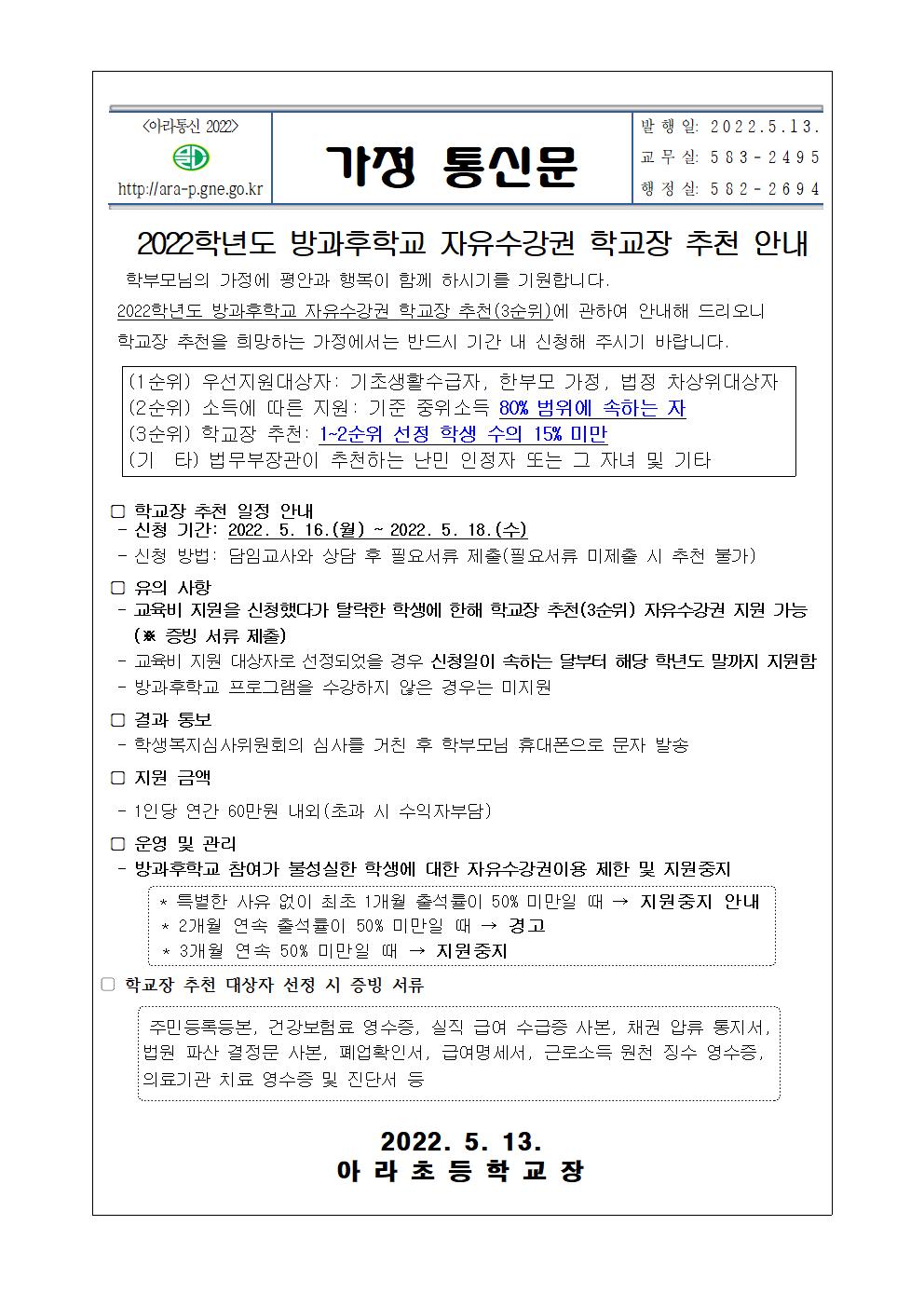2022학년도 방과후학교 자유수강권 학교장 추천 안내장입니다.