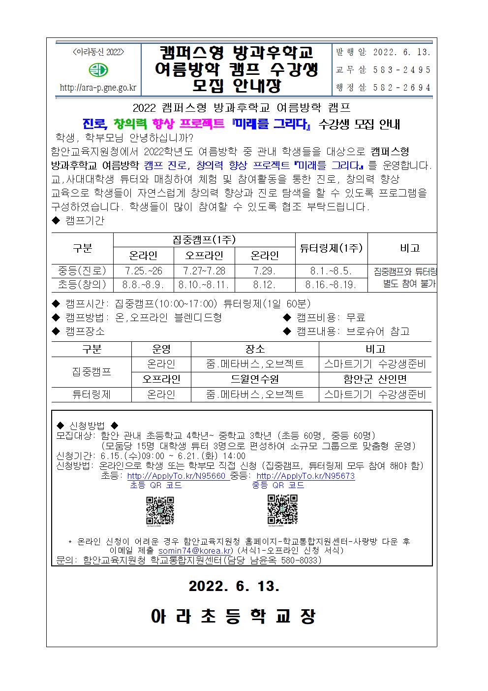 캠퍼스형 방과후학교 여름방학교 캠프 수강생 모집 안내장^^