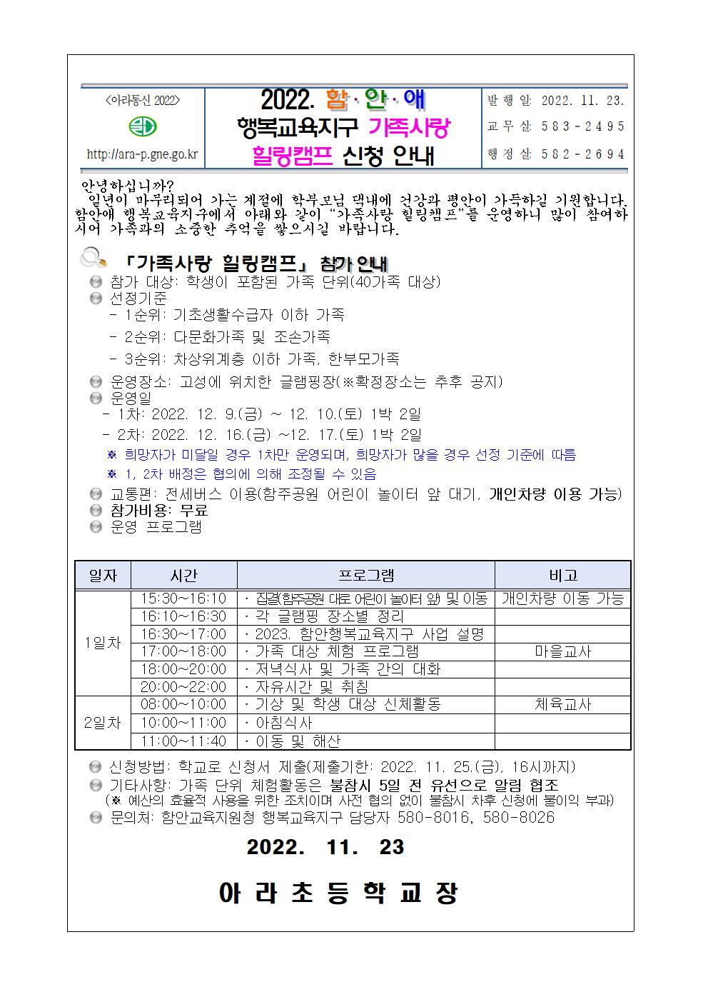 2022. 함안애 행복교육지구 가족사랑 힐링캠프 신청안내장입니다.