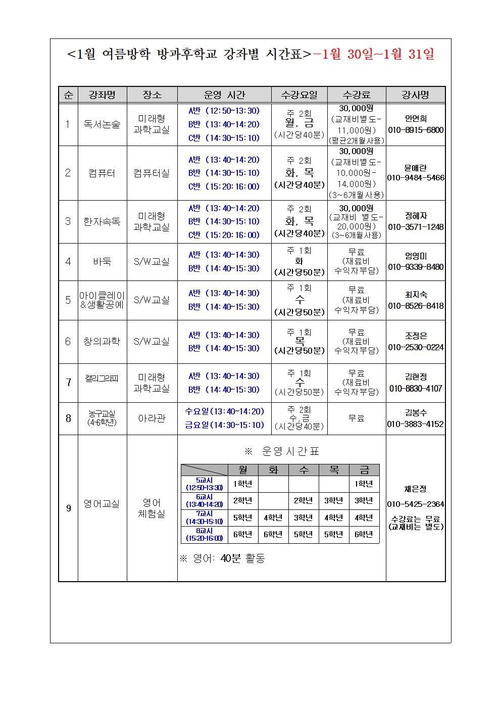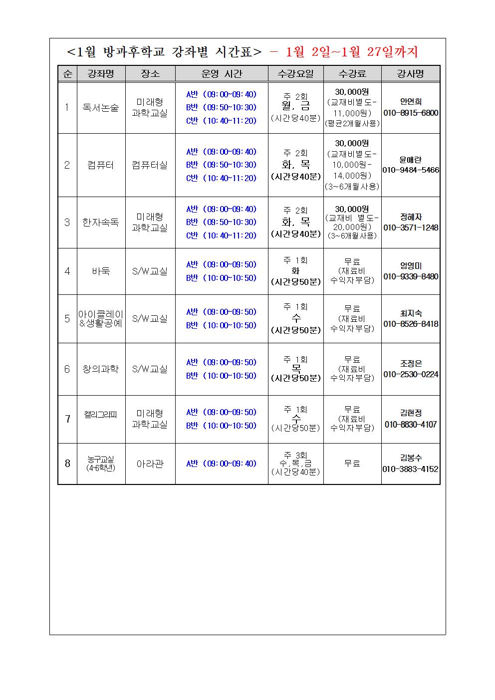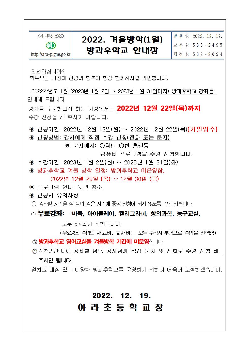 2022. 겨울방학(1월) 방과후학교 안내장입니다.