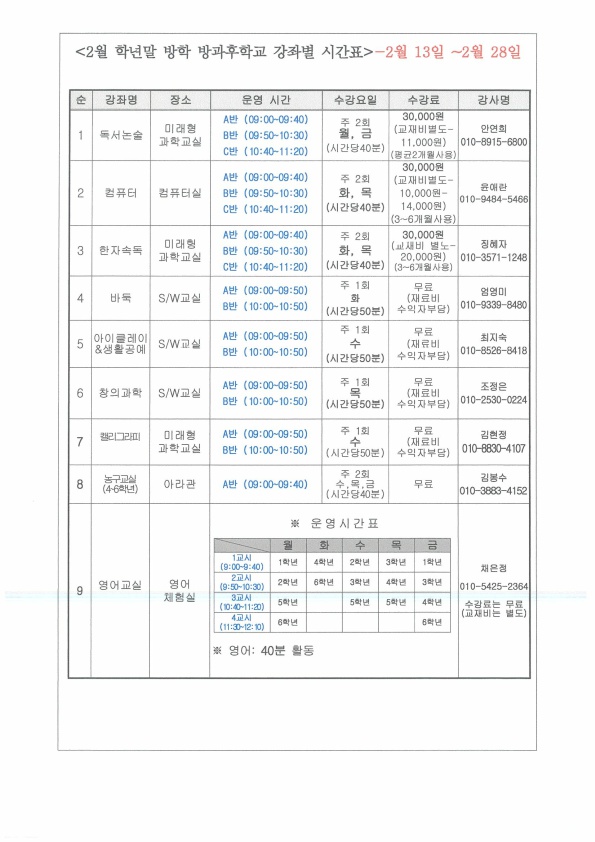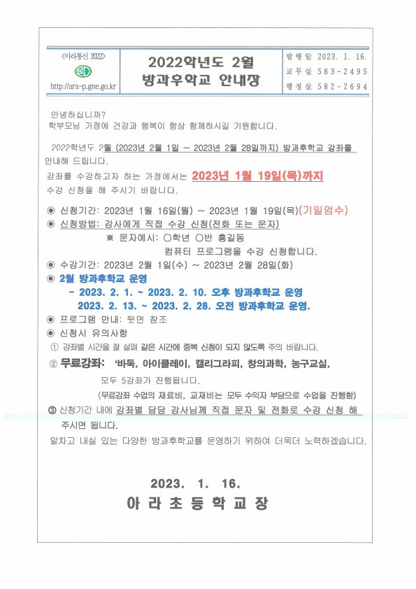 2022학년도 2월 방과후학교 안내장입니다.