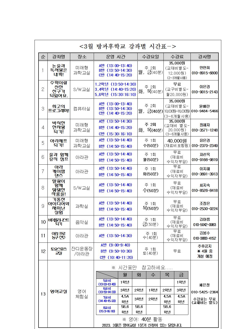 2023. 3월 방과후학교 시간표 시간을 수정하였습니다..