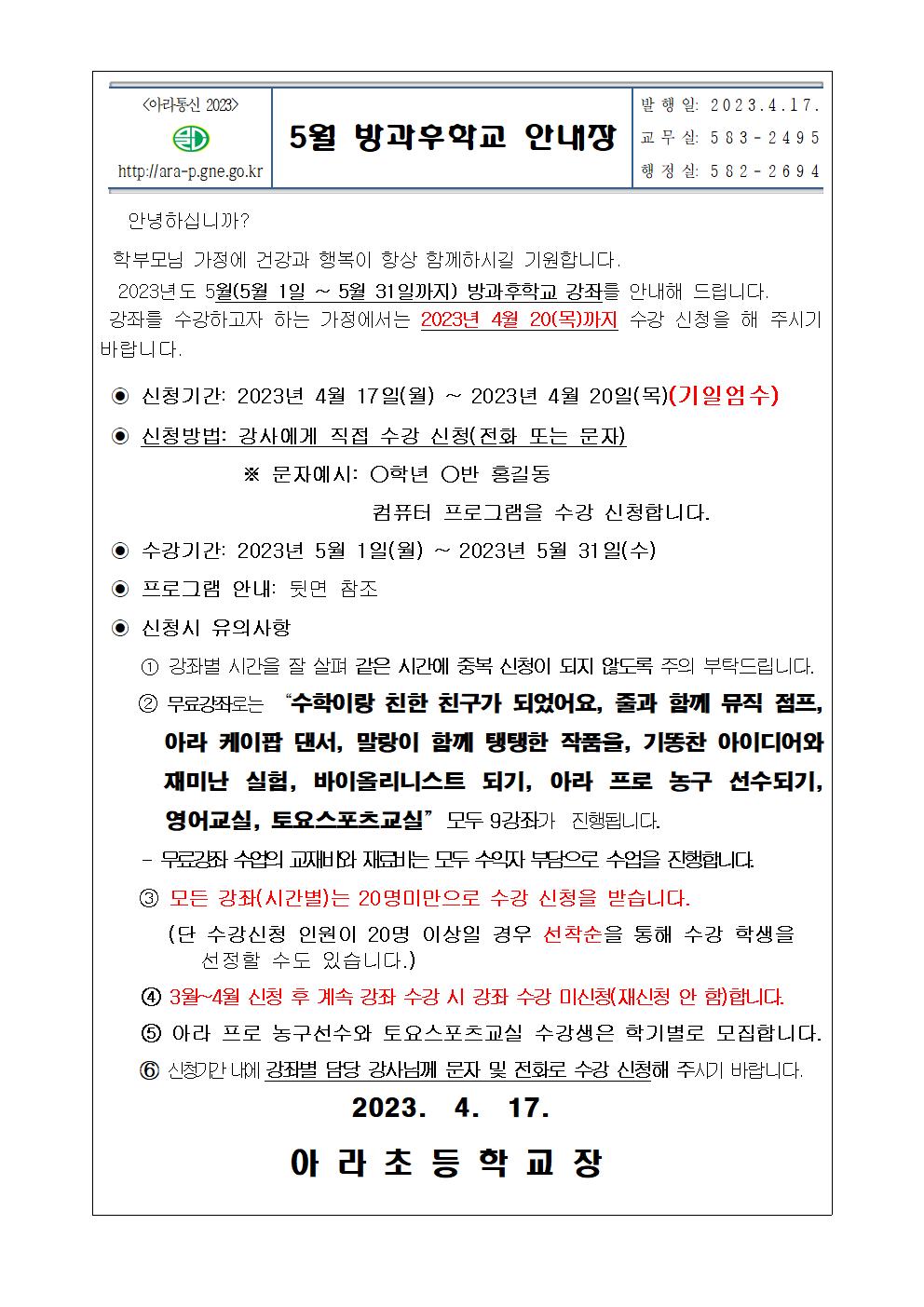 2023. 5월 방과후학교 안내장입니다.