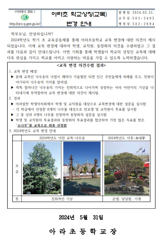 아라초등학교 학교상징(교목) 변경 안내