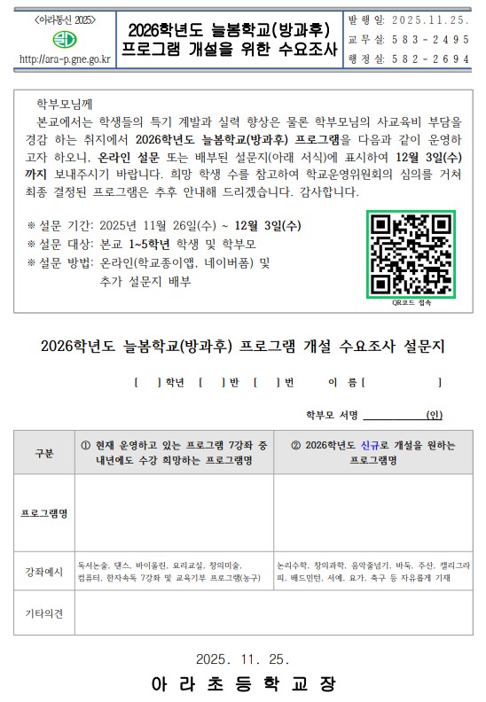 2026학년도 늘봄학교(방과후) 프로그램 개설을 위한 수요조사 실시 안내
